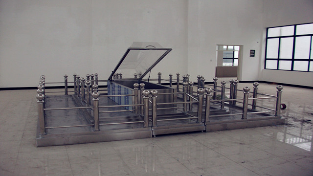 優(yōu)質(zhì)不銹鋼雙層圍欄,內設不銹鋼平臺,綠色草坪,特制液壓升降式透明高罩